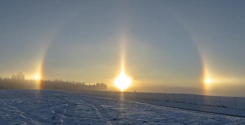Mặt trời giả Sun Dog là do sự khúc xạ ánh sáng qua các tinh thể băng và có thể xuất hiện ở một bên hoặc cả hai phía của mặt trời. “Mặt trời giả xảy ra khi mặt trời hoặc mặt trăng chiếu qua một đám mây ti mỏng bao gồm các tinh thể băng hình lục giác rơi xuống, với trục chính của chúng theo phương thẳng đứng, trái ngược với hiện tượng vầng hào quang xảy ra khi các trục chính được sắp xếp ngẫu nhiên trong một mặt phẳng vuông góc với mặt trời hoặc tia sáng mặt trăng.”